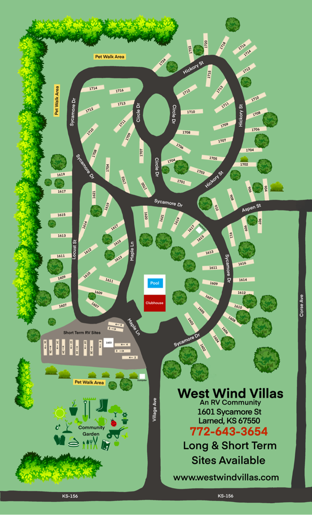 Mail & Packages: Short Term RV sites may receive packages at their sites (not USPS). Use the address: 1603 Maple Ln # Your site number, Larned, KS 67550.